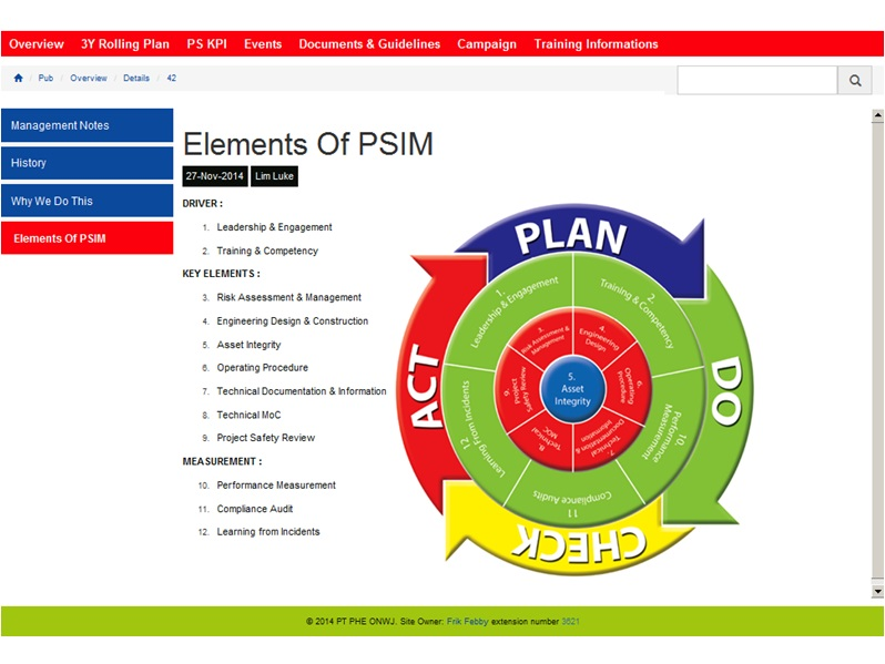 The management of process safety and integrity is a core business activity for PHE ONWJ, which supports the ultimate policy goal of "No Incidents and continuous improvement". PHE ONWJ wanted a tool to help track, audit and maintain the objectives and achievements of staff working within the PSIM framework.