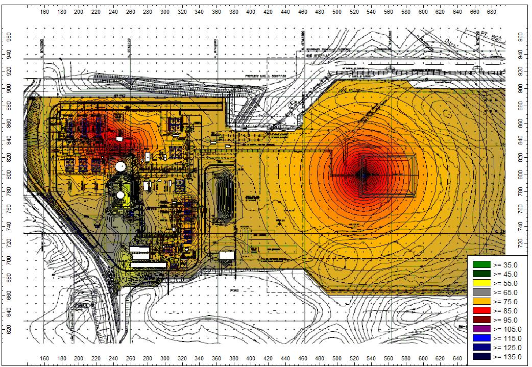 The software simulations resulted in noise level contours around the gas station, which were then assessed against regulatory requirements. Where required, noise control measures were recommended for areas and scenarios where predicted noise levels exceeded regulatory requirements.